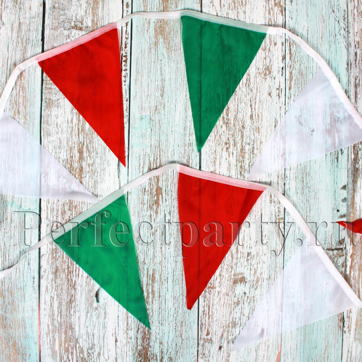 Флажная лента отлично подходит для украшения праздника как в помещении, так и на улице.