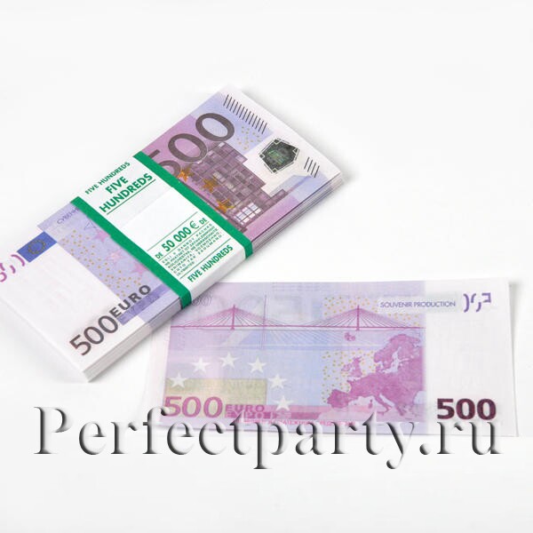 Прикольный муляж пачки денег. Пачка из 100 сувенирных банкнот номиналом 500 евро.