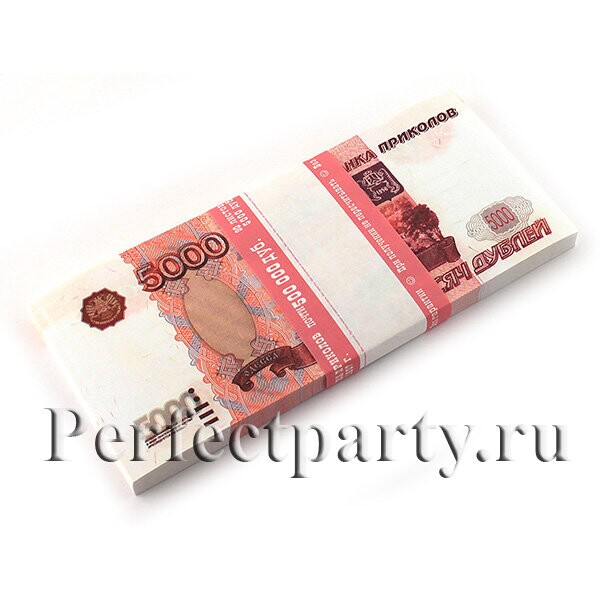 Прикольный муляж пачки денег. Пачка из 100 сувенирных банкнот номиналом 5000 рублей.