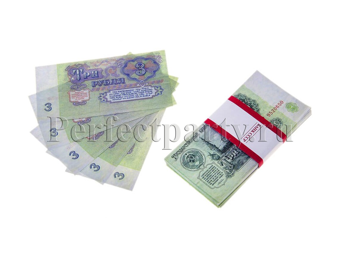Прикольный муляж пачки денег. Пачка из 100 сувенирных банкнот времен СССР, номиналом 3 рубля.