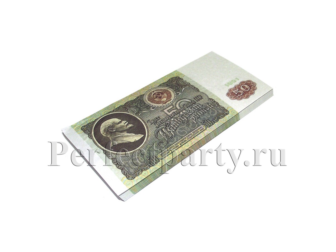 Прикольный муляж пачки денег. Пачка из 100 сувенирных банкнот времен СССР, номиналом 50 рублей.