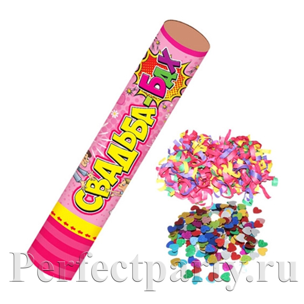 Свадебная хлопушка наполнена серпантином и конфети в форме сердечек