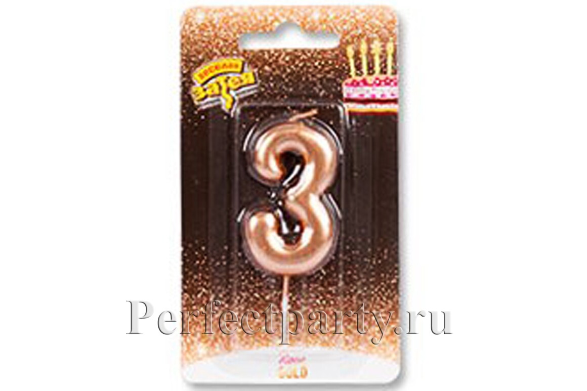 Прекрасная свеча для торта цифра "3" в цвете розовое золото.